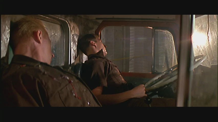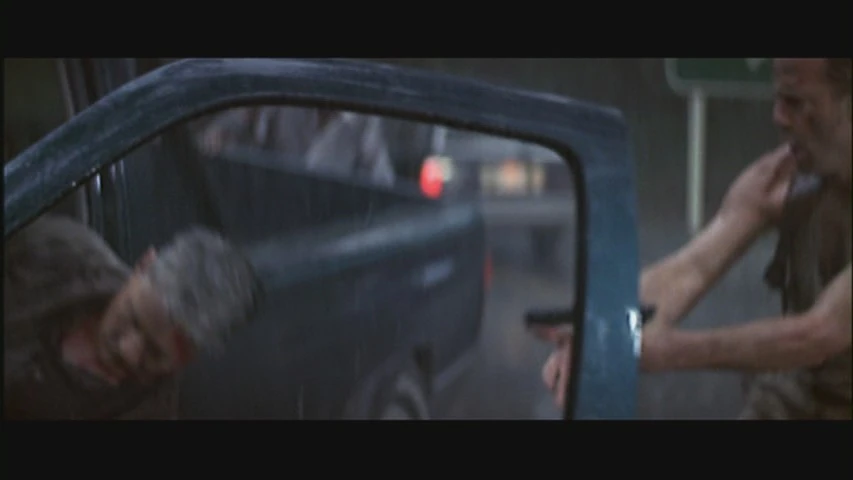 | McClane goes to the driver's side of the moving semi-truck and fires his pistol at Robinson through side door in order to hijack the vehicle. | |||||