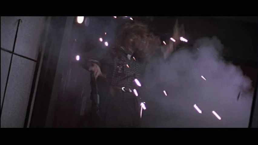 | McClane tosses the fire extinguisher and fires at it, causing it to explode and pushes the henchman through the window and into the hood of a truck. | |||||