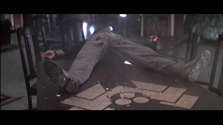 | Marco cornered McClane at the end of the conference room table, but McClane unloads his magazines through the table, shot Marco around the groin and somewhat the chest. | |||||