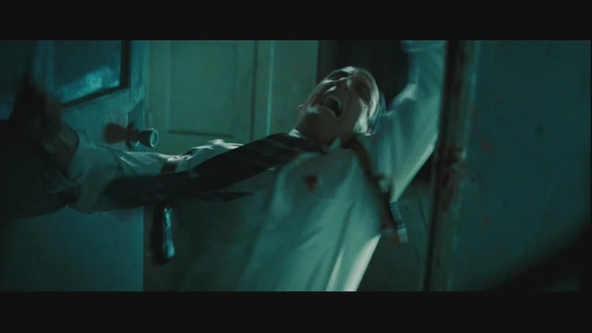 | McClane grabs the henchman through the wall near Farrell's door, pulls him through it and breaks his neck. | |||||