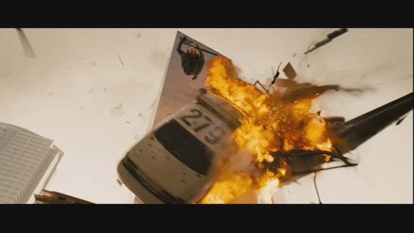 | McClane drives the Homeland Security car into the helicopter and jumps out, allowing the car to launch from the tool booth and into the helicopter, killing the pilot inside it. | |||||